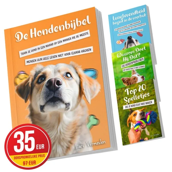 Je ontvangt 3 waardevolle bonus e-books (totale waarde: €66) die je nergens apart kunt kopen: “Langlevendheid begint in de voerbak” – ontdek hoe voeding het gedrag én de gezondheid van je hond beïnvloedt. “Waarom Doet Hij Dat? – 100 Hondenproblemen” – eindelijk begrijp je waarom je hond doet wat hij doet. “Top 20 Spelletjes die je hond écht moe maken” – leer spelletjes die je hond mentaal uitputten, zodat hij thuis rustig is. Alle drie gratis bij je bestelling.
